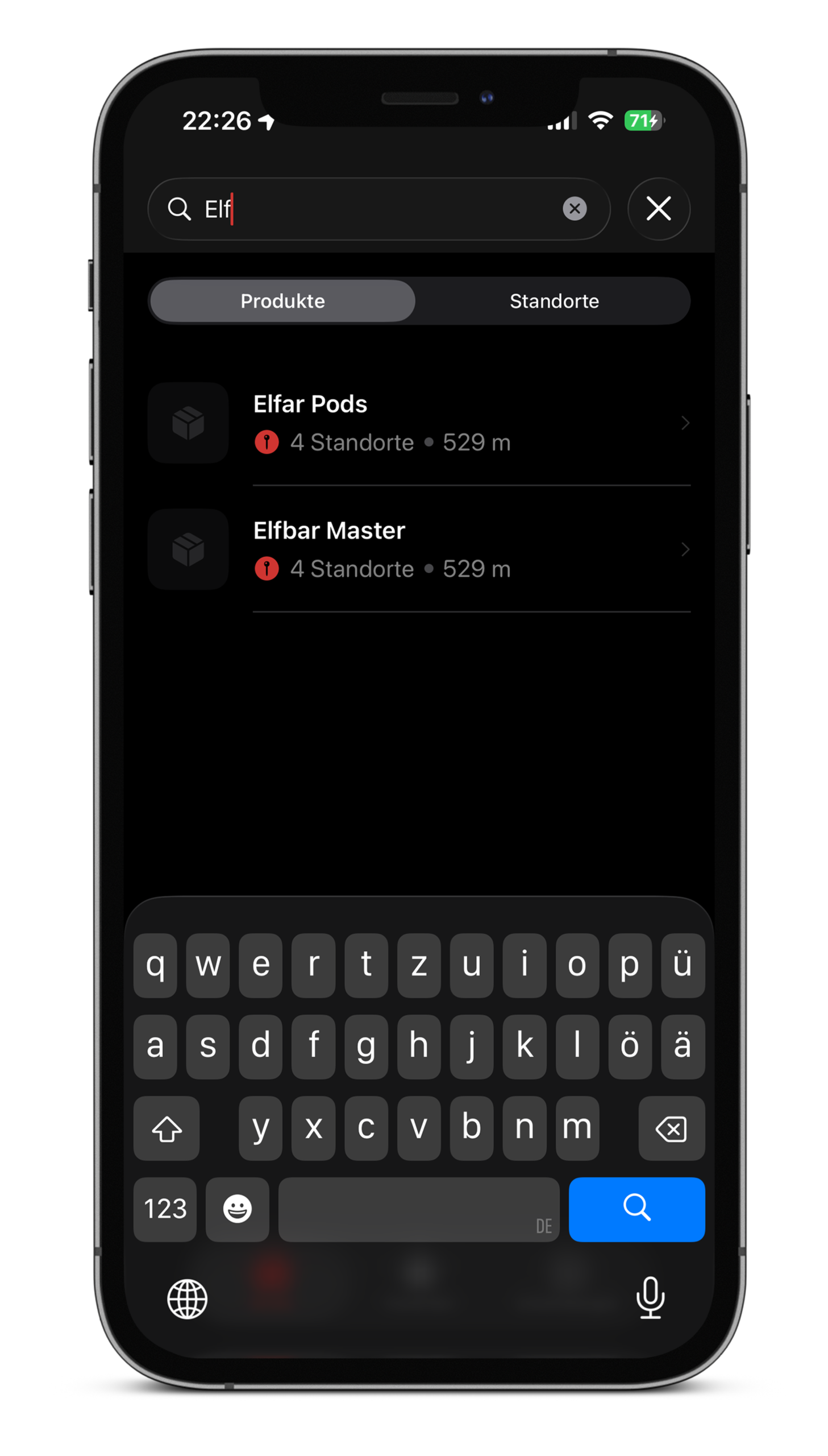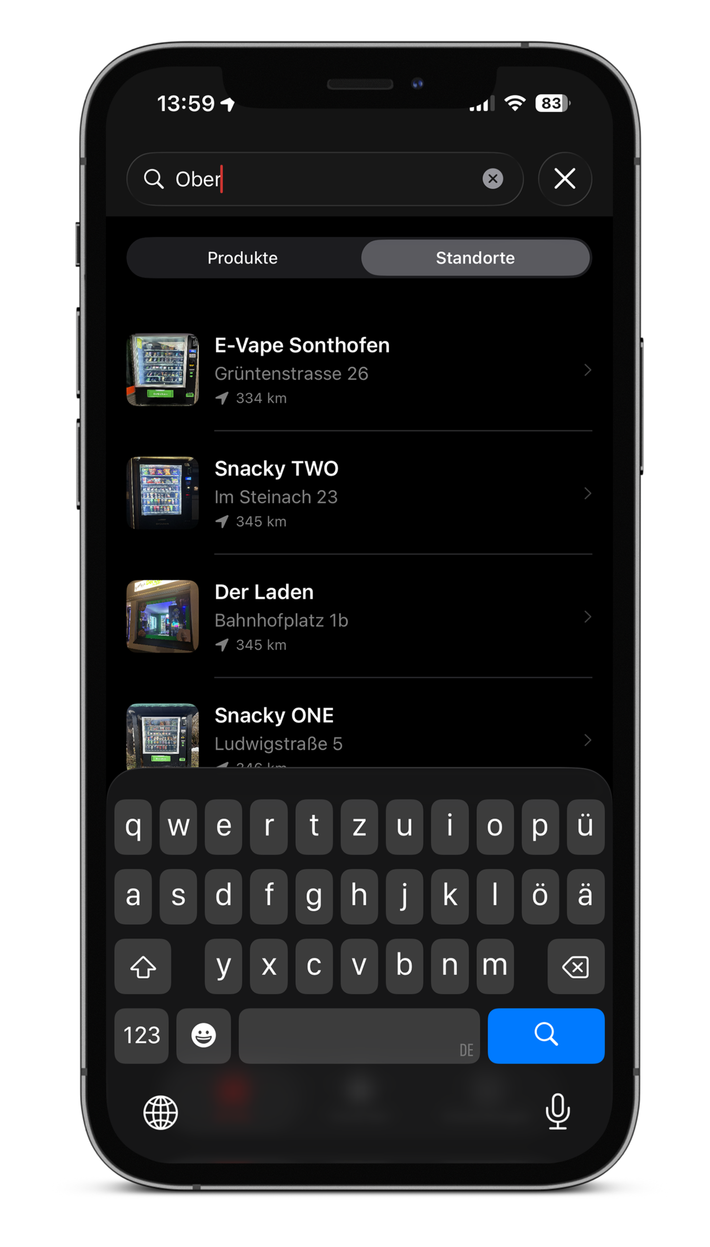 App User können einfach nach Produkten Suchen. Die näheren Automaten mit den Produkten werden zu erst angezeigt.